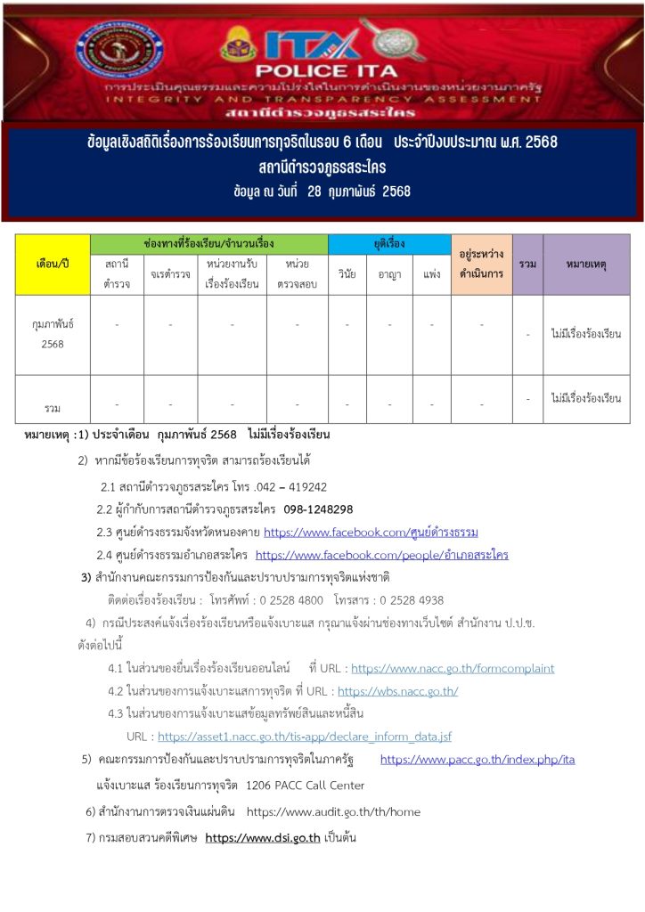 ข้อมูลเชิงสถิติเรื่องร้องเรียนการทุจริต เดือน กุมภาพันธ์ 2568