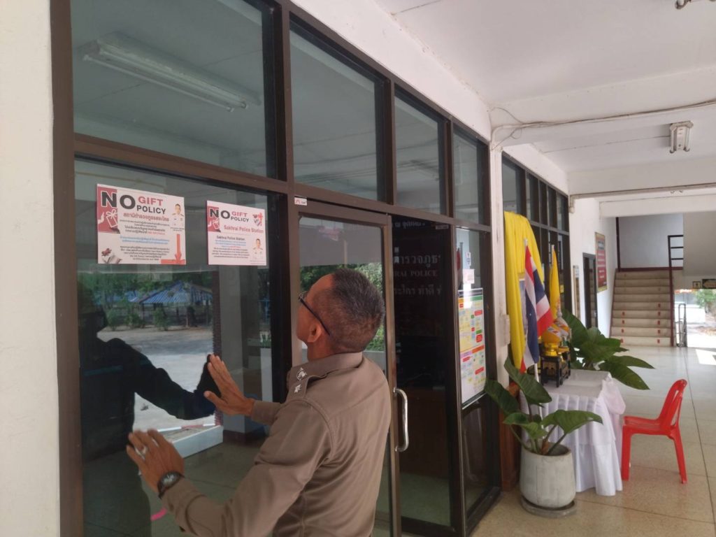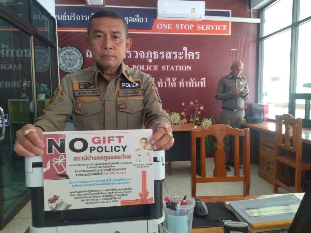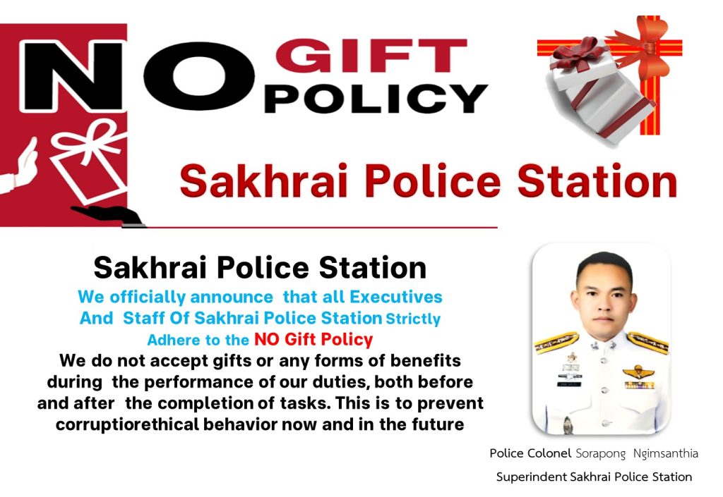 ครั้งที่ 2 วันที่ 11 มีนาคม 2568 เวลา 10.00 น. พ.ต.อ.สรพงษ์ งิมสันเทียะ ผกก.สภ.สระใคร พร้อมด้วยข้าราชการตำรวจ สภ.สระใคร จัดกิจกรรมประกาศเจตนารมณ์ต่อต้านการทุจริต ประจำปี 2568 ไม่ขอรับของขวัญและของกำนัลทุกชนิดจากการปฏิบัติหน้าที่ (NO Gift Policy)