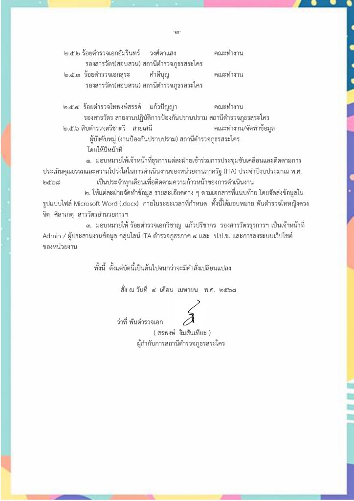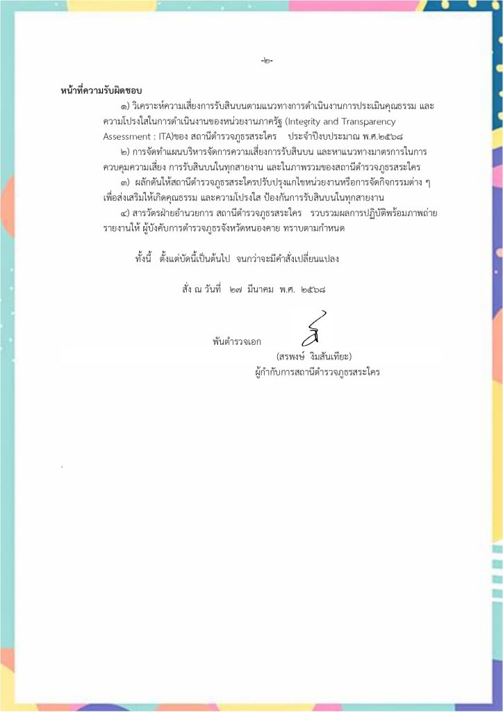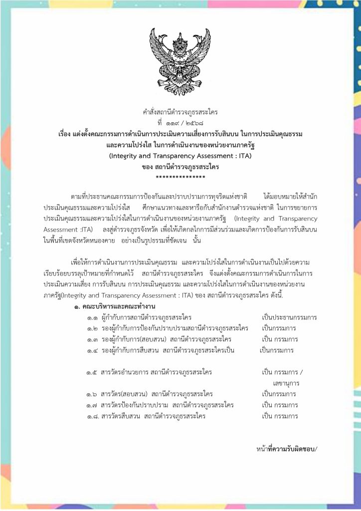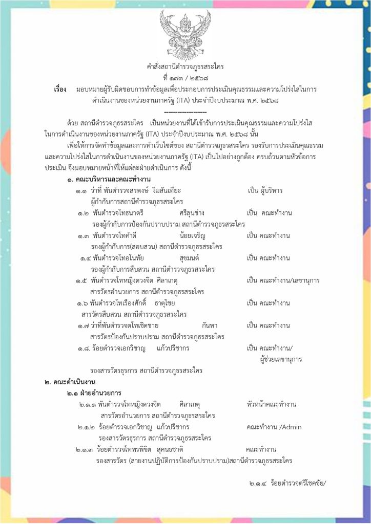 2.คำสั่งสถานีตำรวจภูธรสระใครที่ 173 /2568  เรื่อง    มอบหมายผู้รับผิดชอบการทำข้อมูลเพื่อประกอบการประเมินคุณธรรมและความโปร่งใสในการดำเนินงานของหน่วยงานภาครัฐ (ITA) ประจำปีงบประมาณ พ.ศ. 2568