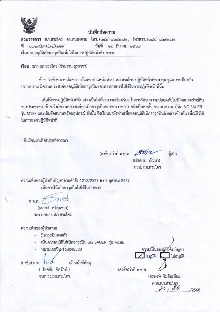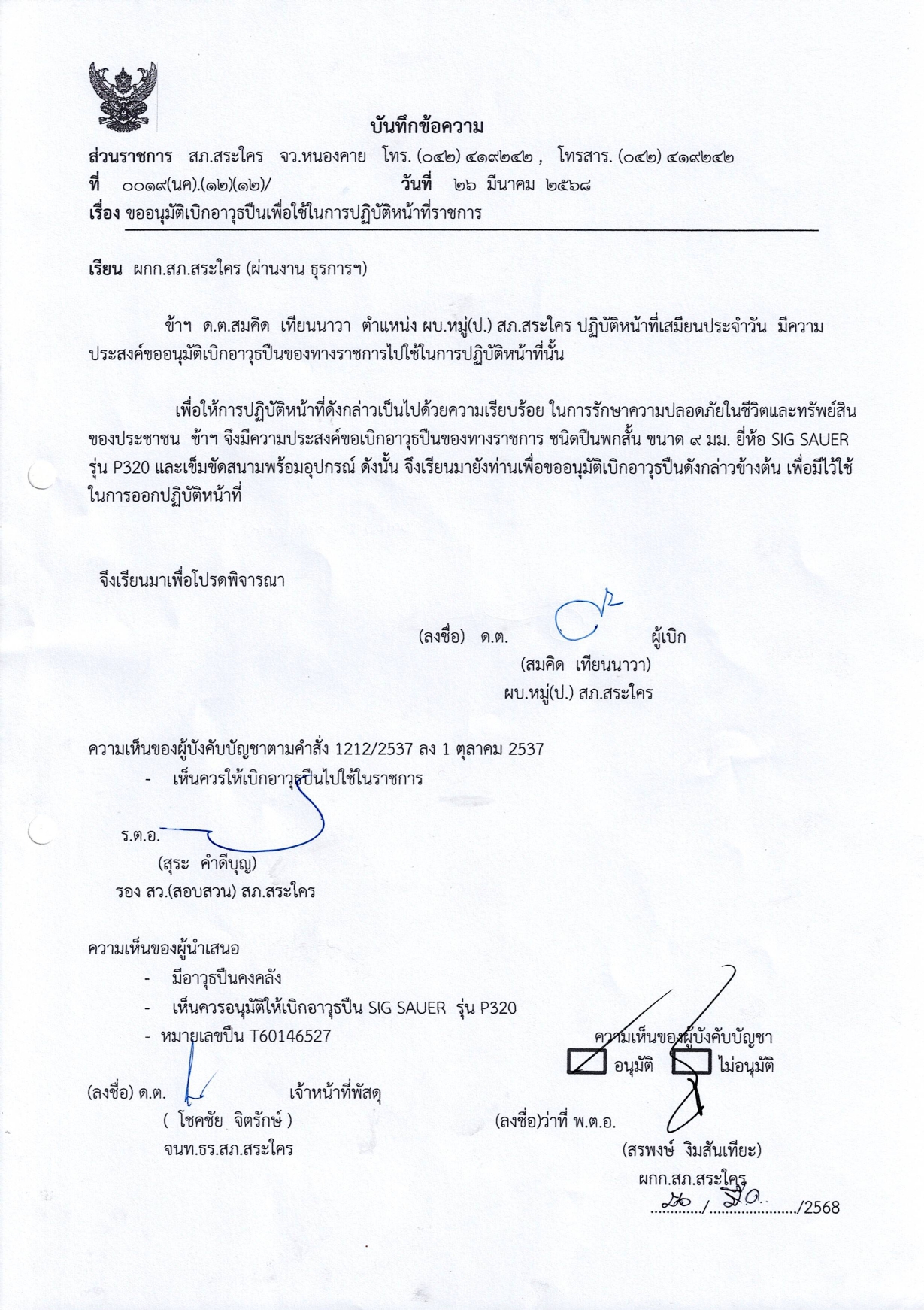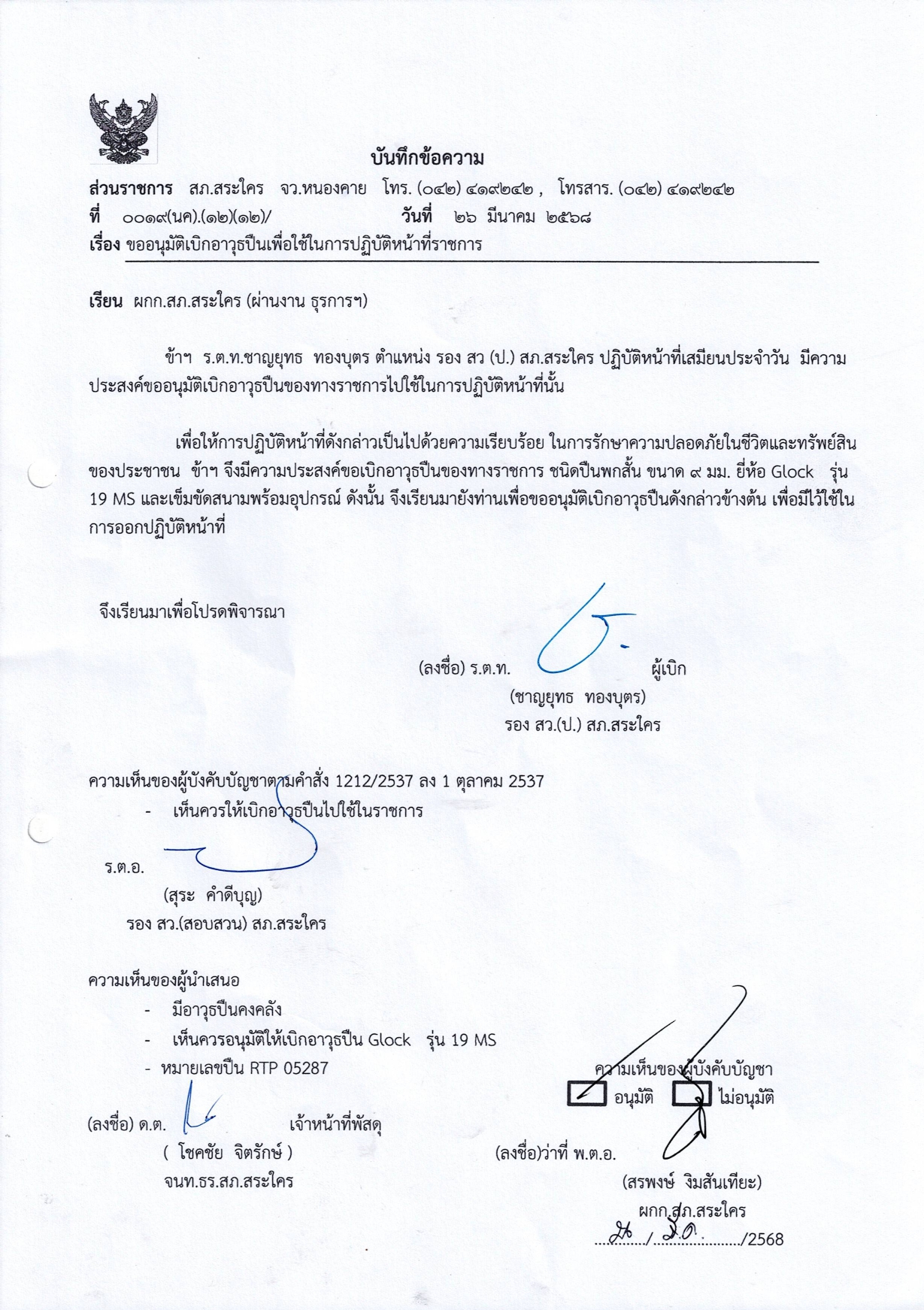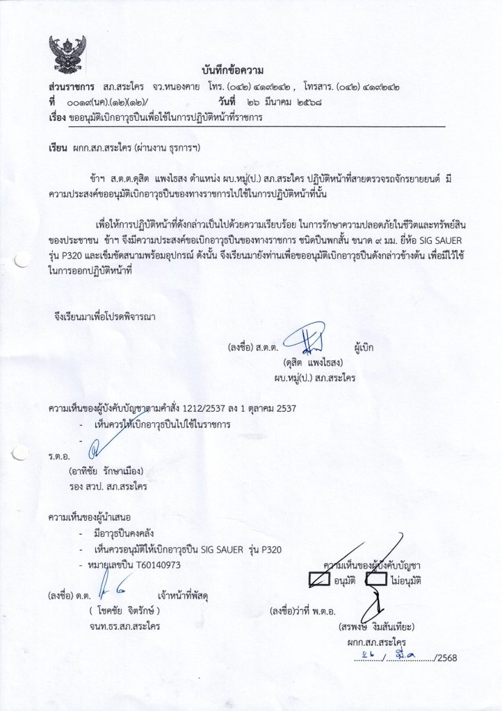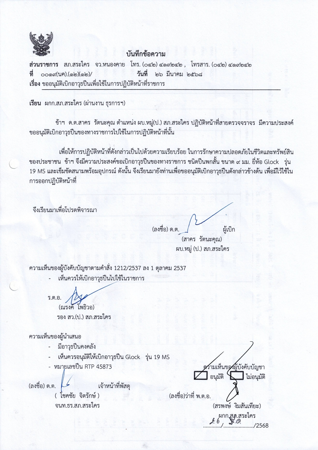วันที่ 2 เมษายน  2568  เวลา  10.00 น.  พ.ต.อ.สรพงษ์  งินสันเทียะ  ผกก.สภ.สระใคร  พ.ต.ท.ธนาตรี  ศรีลุนช่าง รอง ผกก.ป.สภ.สระใคร  พ.ต.ท.คำดี  น้อยเจริญ   รอง ผกก.(สอบสวน)สภ.สระใคร ได้ตรวจสอบทรัพย์สินของทางราชการ เช่น     ยานพาหนะ  อาวุธปืน คงคง เป็นต้น  เพื่อให้เจ้าที่ผู้รับผิดชอบได้เข้าใจในการจัดการทรัพย์สินของราชการ ของบริจาค          เพื่อป้องกันมิให้เกิดการทุจริตภายในหน่วยงาน