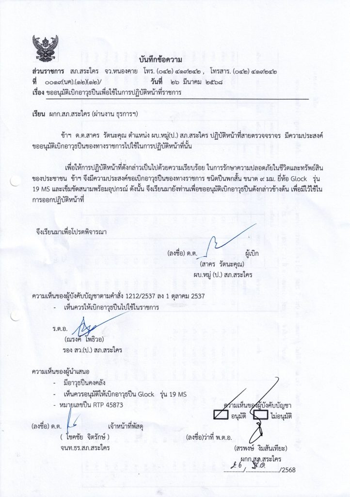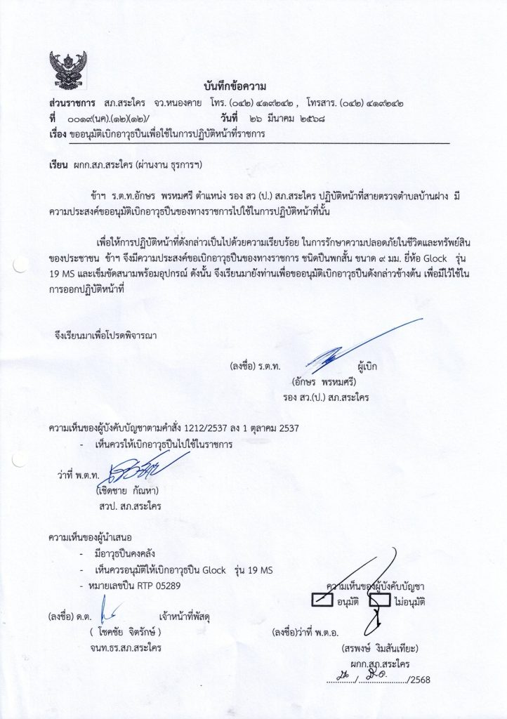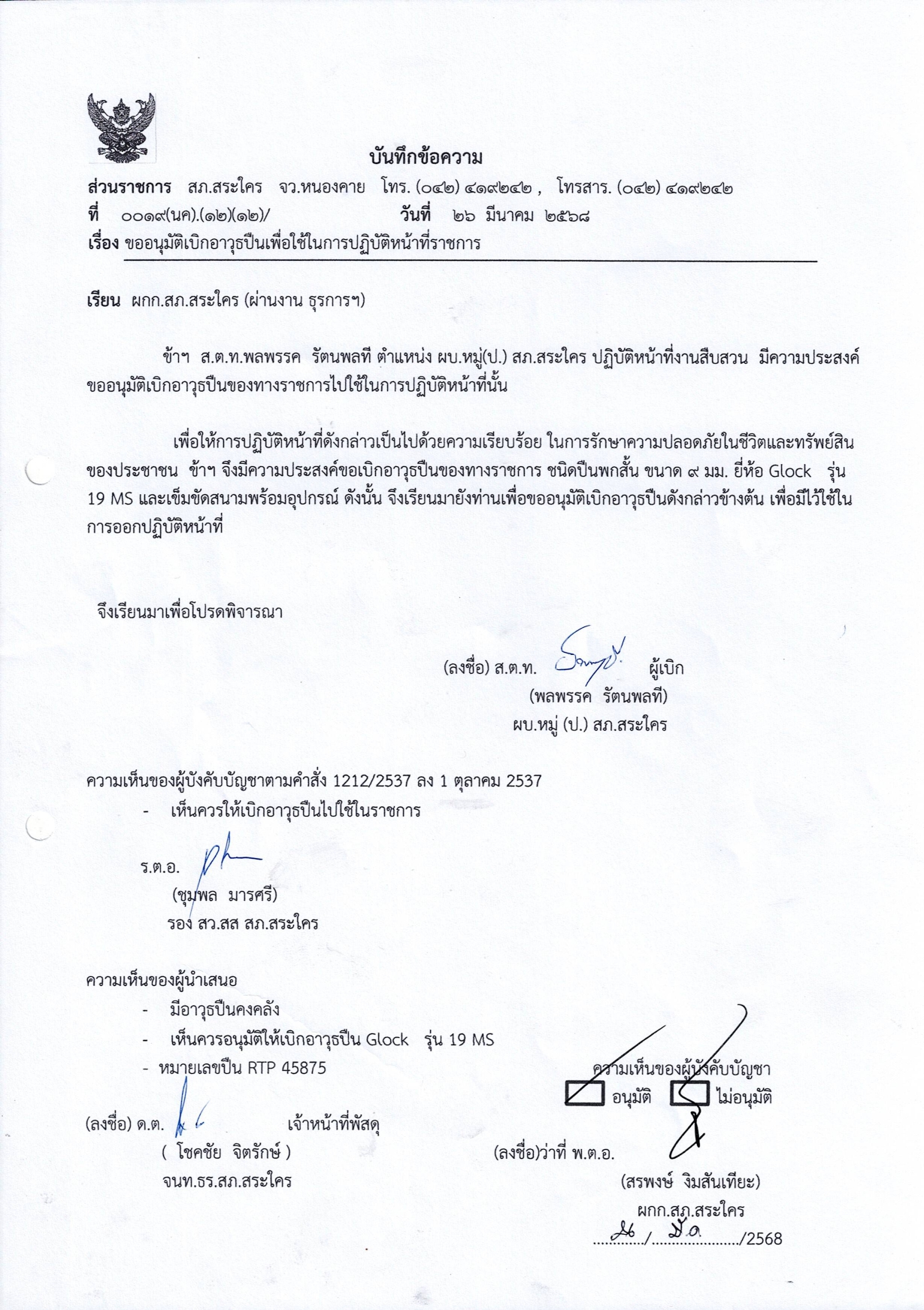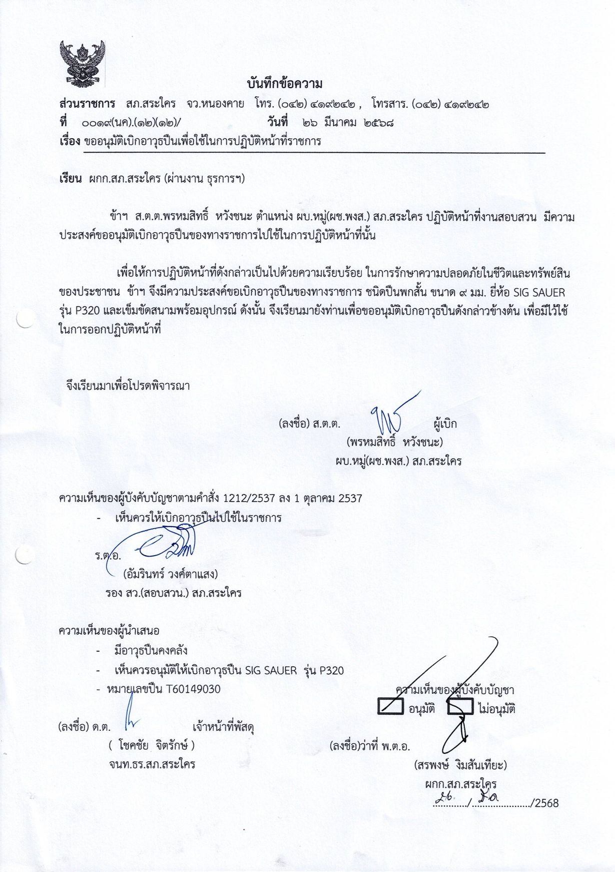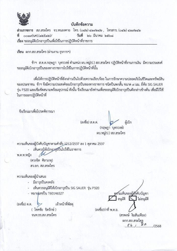 วันที่ 2 เมษายน  2568  เวลา  10.00 น.  พ.ต.อ.สรพงษ์  งินสันเทียะ  ผกก.สภ.สระใคร  พ.ต.ท.ธนาตรี  ศรีลุนช่าง รอง ผกก.ป.สภ.สระใคร  พ.ต.ท.คำดี  น้อยเจริญ   รอง ผกก.(สอบสวน)สภ.สระใคร ได้ตรวจสอบทรัพย์สินของทางราชการ เช่น     ยานพาหนะ  อาวุธปืน คงคง เป็นต้น  เพื่อให้เจ้าที่ผู้รับผิดชอบได้เข้าใจในการจัดการทรัพย์สินของราชการ ของบริจาค          เพื่อป้องกันมิให้เกิดการทุจริตภายในหน่วยงาน
