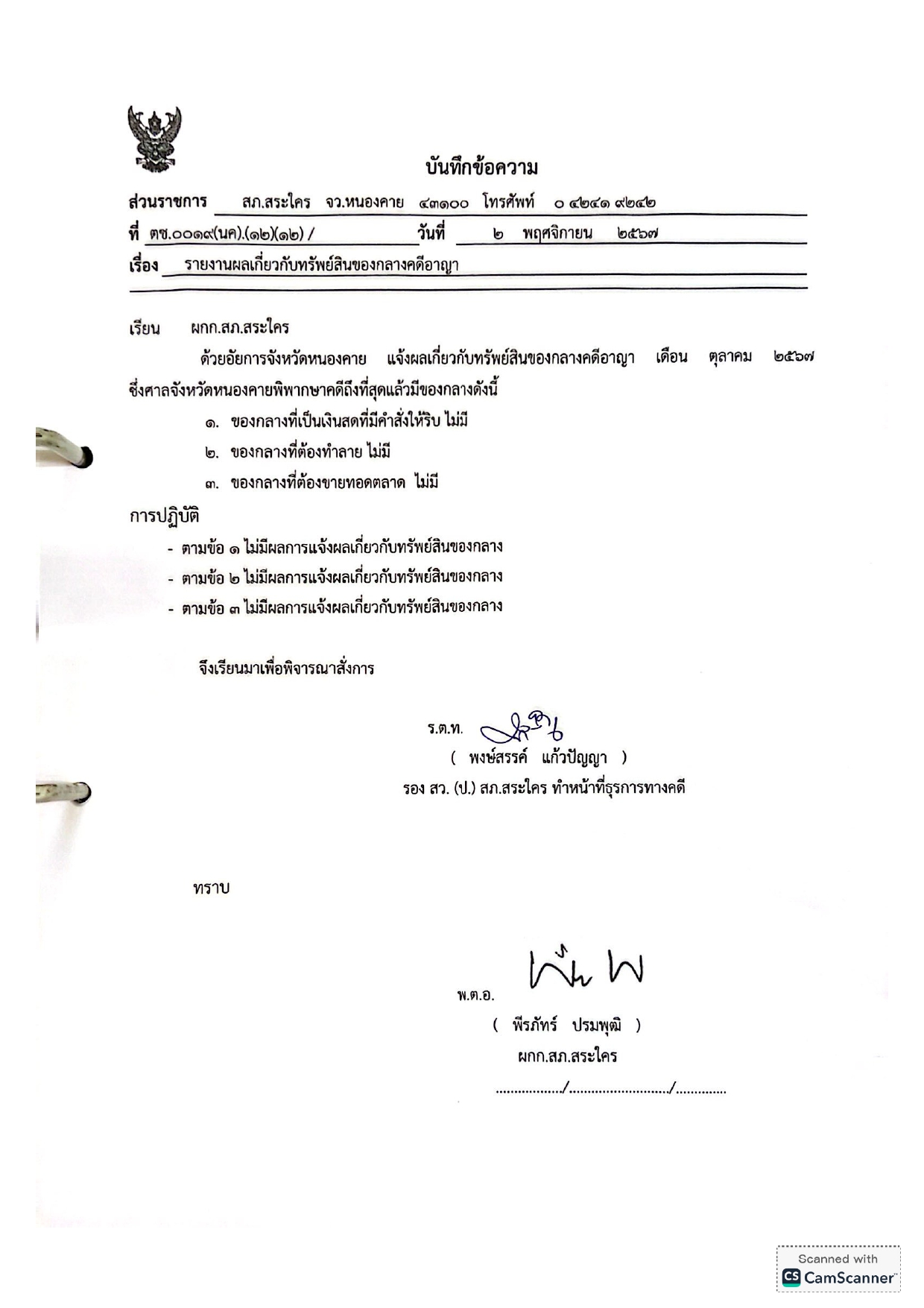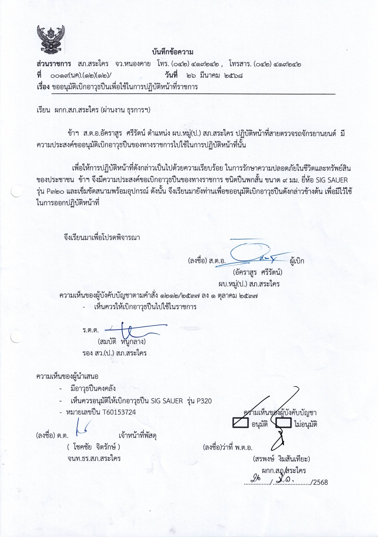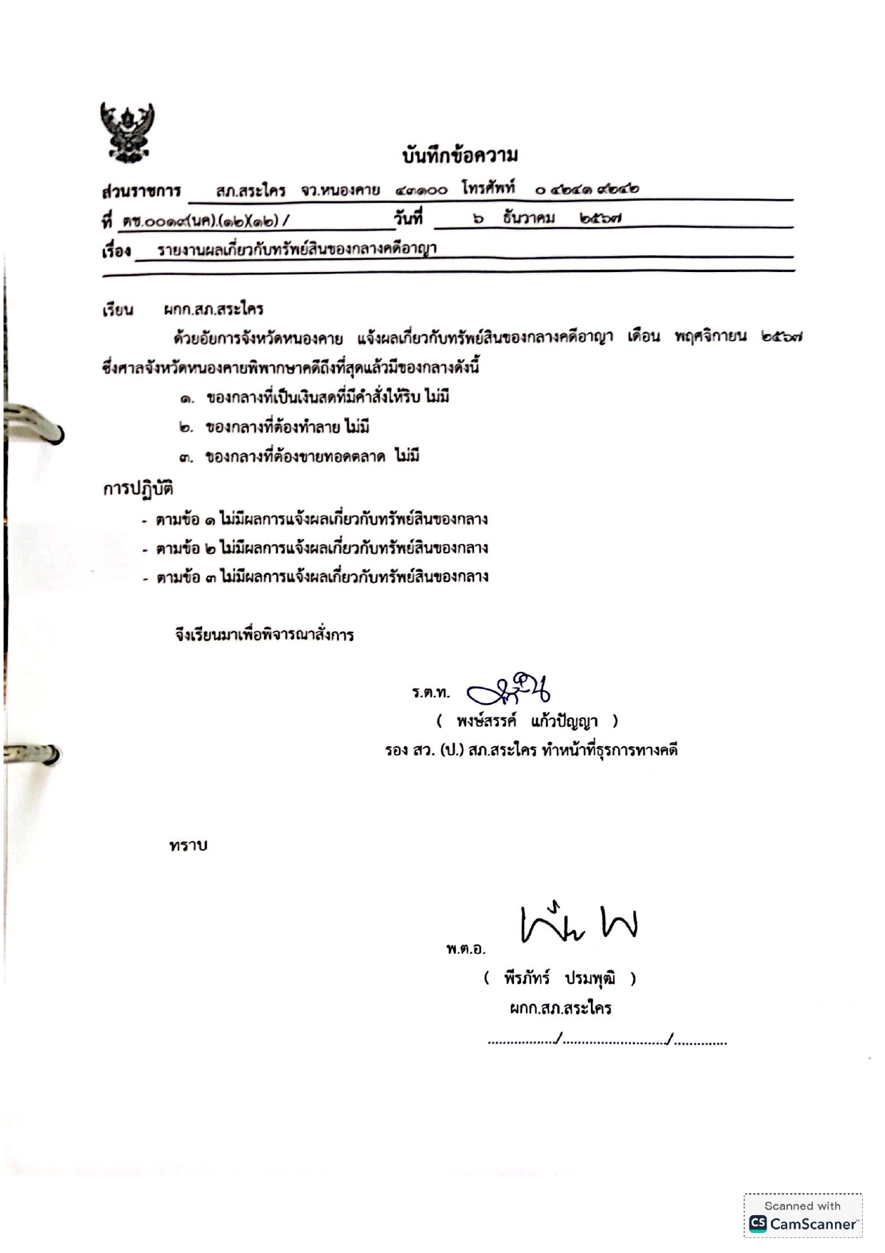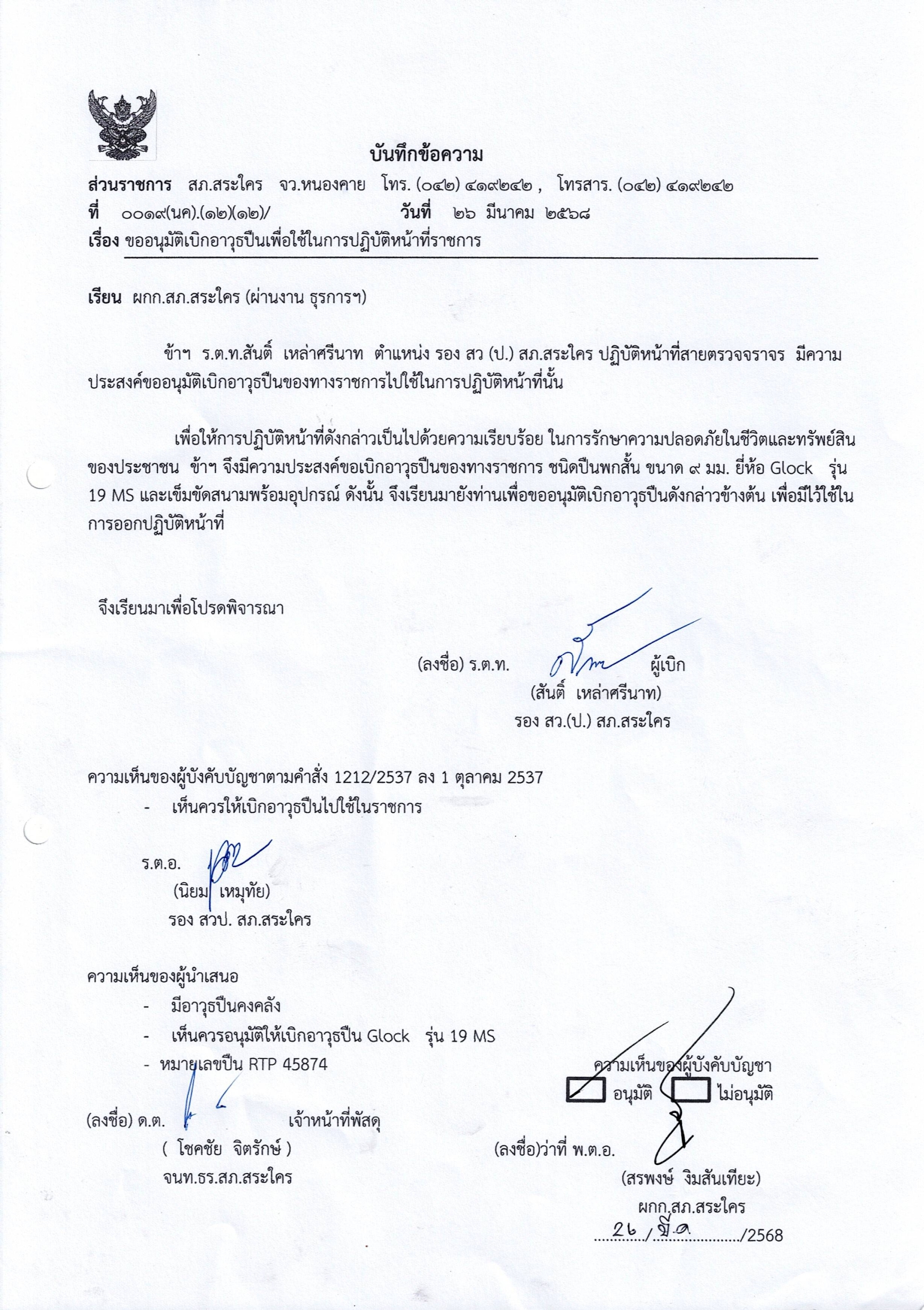 วันที่ 2 เมษายน  2568  เวลา  10.00 น.  พ.ต.อ.สรพงษ์  งินสันเทียะ  ผกก.สภ.สระใคร  พ.ต.ท.ธนาตรี  ศรีลุนช่าง รอง ผกก.ป.สภ.สระใคร  พ.ต.ท.คำดี  น้อยเจริญ   รอง ผกก.(สอบสวน)สภ.สระใคร ได้ตรวจสอบทรัพย์สินของทางราชการ เช่น     ยานพาหนะ  อาวุธปืน คงคง เป็นต้น  เพื่อให้เจ้าที่ผู้รับผิดชอบได้เข้าใจในการจัดการทรัพย์สินของราชการ ของบริจาค          เพื่อป้องกันมิให้เกิดการทุจริตภายในหน่วยงาน